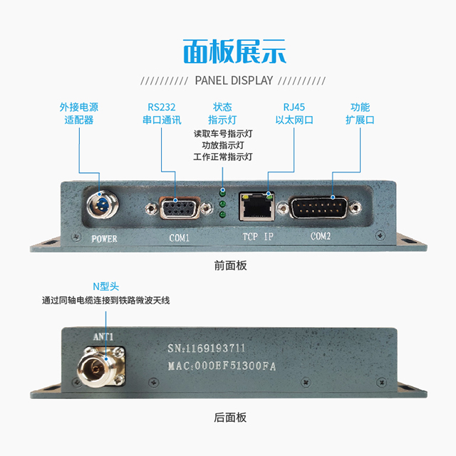本设备主要用来读取安装在火车车辆底部的电子标签信息,实现铁路车号自动识别,简化车辆在站的作业程序,缩短了车辆在站的停留时间,提高了火车车辆的利用率。