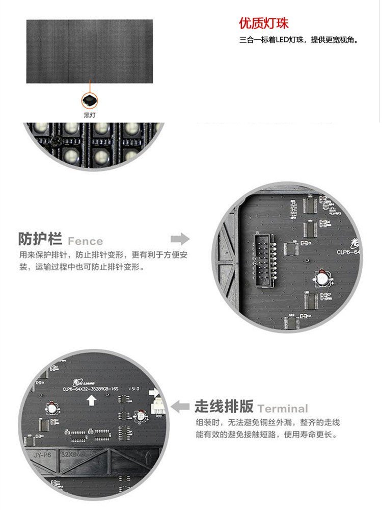 5.超长寿命:选用高品质的发光元器件为显示屏的核心材质并采用了自己的线路板设计,从根本上保证了产品的使用寿命。