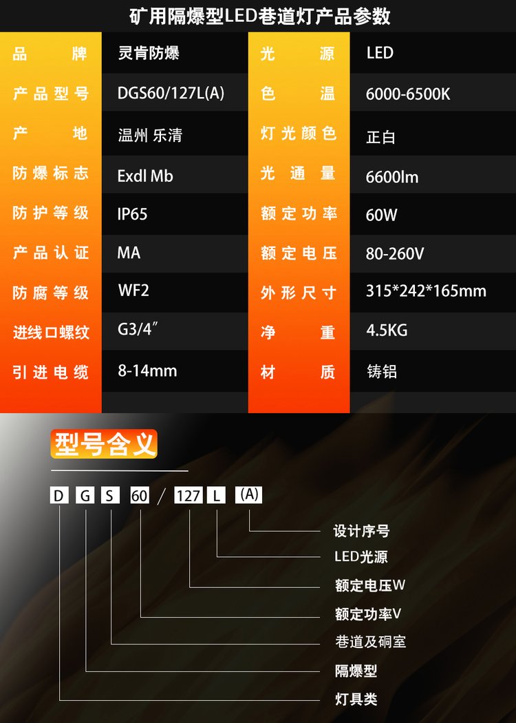工矿灯具 井下用防爆型LED照明灯DGS60/127L(A)矿用隔爆型巷道灯 品牌 | 灵肯防爆 | ||