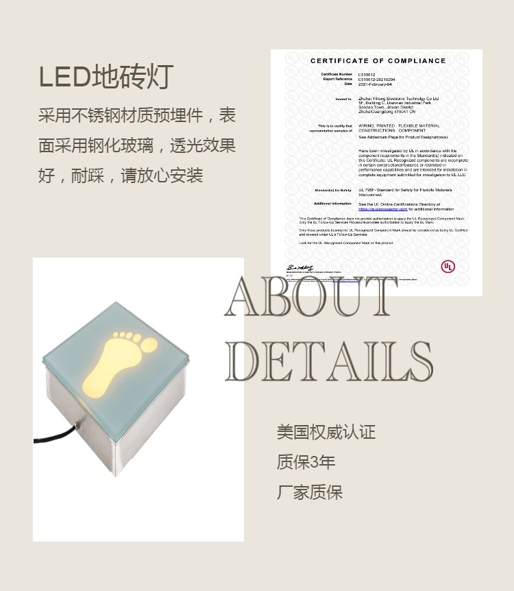此款产品采用不锈钢钢化玻璃,光源采用LED光源,外置驱动,保障安全,内部灌胶防水,保障户外使用,光线柔和,不刺眼,广场暗藏安装,耐踩,不怕踩破,质保3年。深圳市宇创光光电厂家保障。