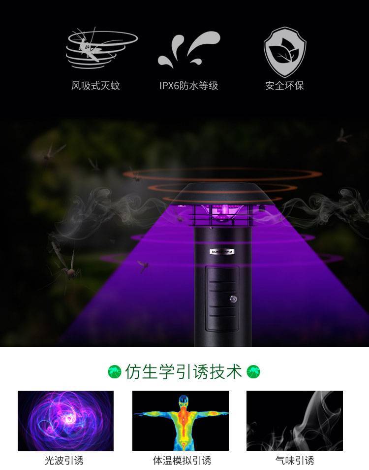 草坪灯式灭蚊器采用欧美产品质量安全标准,IPX6级防水设计标准。环保、节能、人性化设计。高效、环保灭蚊。经济省电、安全可靠。