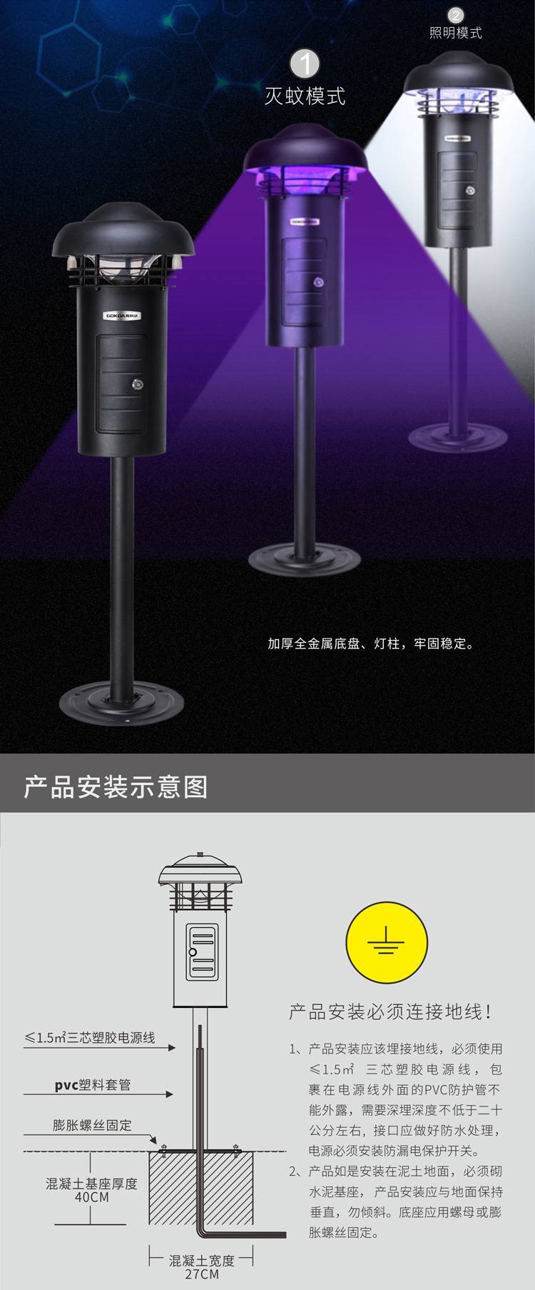 高科达GOKDA户外灭蚊灯风吸式灭蚊,使用全金属机身,工业设计造型美观,具户外照明、灭蚊、环境装饰一体化功能。运用生物诱蚊技术和物理灭蚊设备,花园灭蚊虫采用诱蚊光波 蚊虫信息素气味 体温模拟引诱蚊虫靠近,高速旋转的涡流风机将蚊虫吸入储蚊盒并风干至死,安全。从而达到绿色除虫、环保灭蚊的目的。