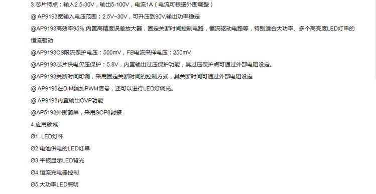 应用领域 | LED 灯杯 ? 电池供电的 LED 灯串 ? 平板显示 LED 背光 ? 恒流充电器控制 ? 大功率 LED 照明 | ||