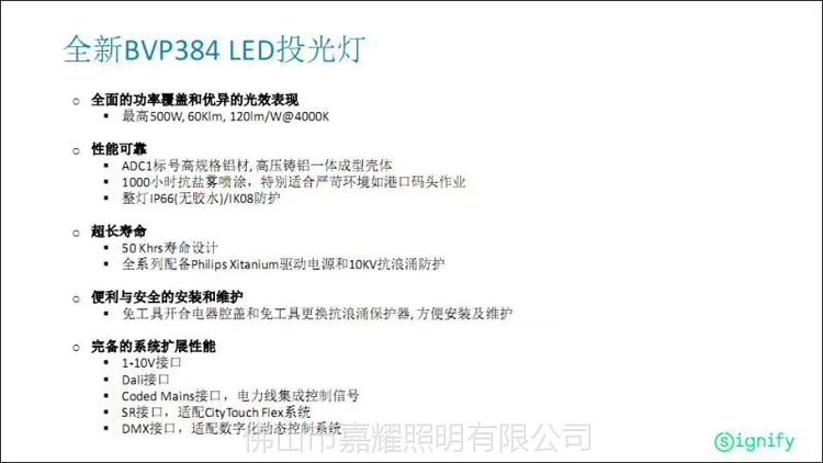 飞利浦BVP384500以及6万流明的光通输出实现1000W金卤灯的一对一替换,多种光学透镜轻松覆盖各类泛光照明应用