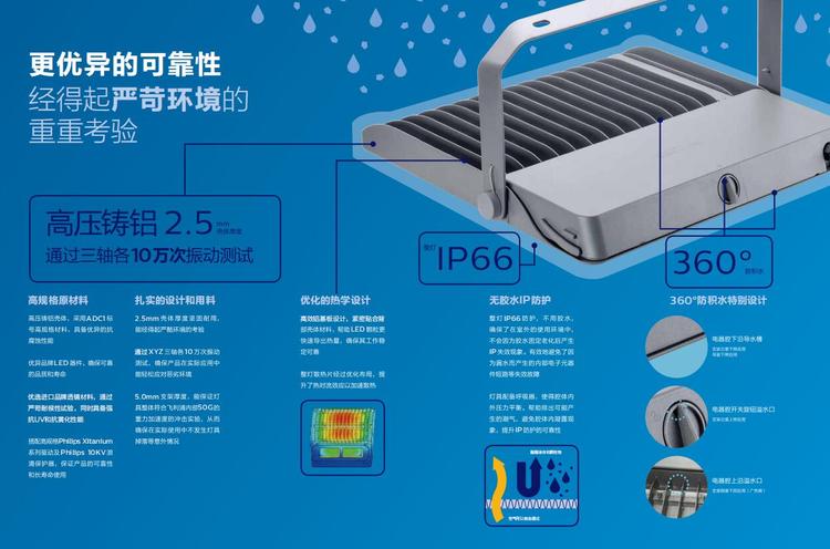 灯具壳体采用高压铸铝材料一体成型,标配的100小时抗盐雾喷涂及10KV抗浪涌保护器确保了优异的可靠性