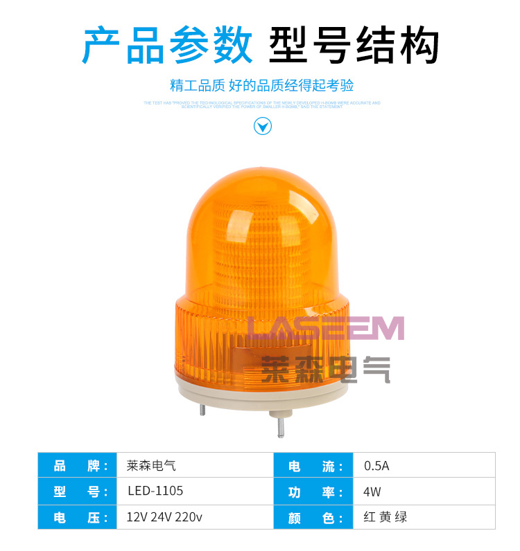 5、适于用恶劣环境下正常工作警示灯通常是用在机械设备等开发。一般情况下,用处可以提供多样的长度的产品的,有灯罩组合的构造,需要时一边方向的灯罩可以组合复合颜色。此外,还可以根据光源形式的不同,分为:1灯泡旋转灯;2LED闪光灯;3氙气灯管频闪灯,其中LED闪光形式的是灯泡旋转形式的升级版,使用寿命更长,更节能,更环保!