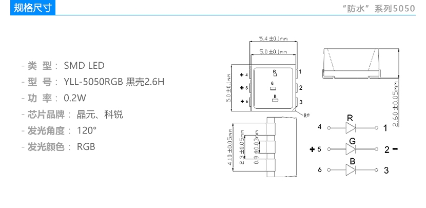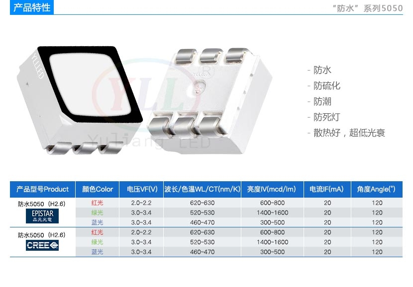 防水系列5050rgb 2.6H LED灯珠特性及参数: