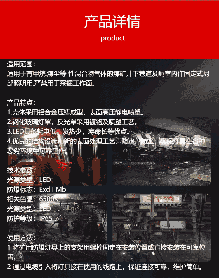 2、完全可以替代煤矿井下以及含有爆炸性气体场合的防爆白炽灯、防爆荧光灯、防爆节能灯、防爆钠灯等。