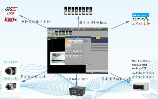 GVS-X系统支持标准千兆网协议,能有效支持行业内的常规千兆网工业相机,如:巴斯勒,印美金,灰点,堡盟,索尼。国产相机如:海康,麦德威视,华用,大恒,大华等。系统集成了高度封装的包括定位,缺陷检测,读码识别,几何测量等功能的视觉算法工具。用户无需编写程序,只需简单的配置引导即可完成多样化的视觉方案。