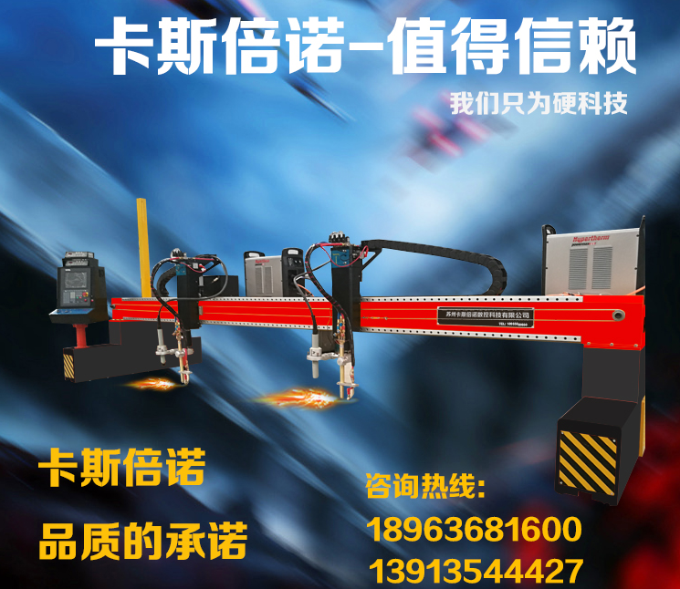 数控龙门等离子切割机的切割厚度取决于其所配置的等离子电源。等离子电源功率越大,所切割的钢板越厚。常用等离子电源主要有63A、100A、120A、200A等。