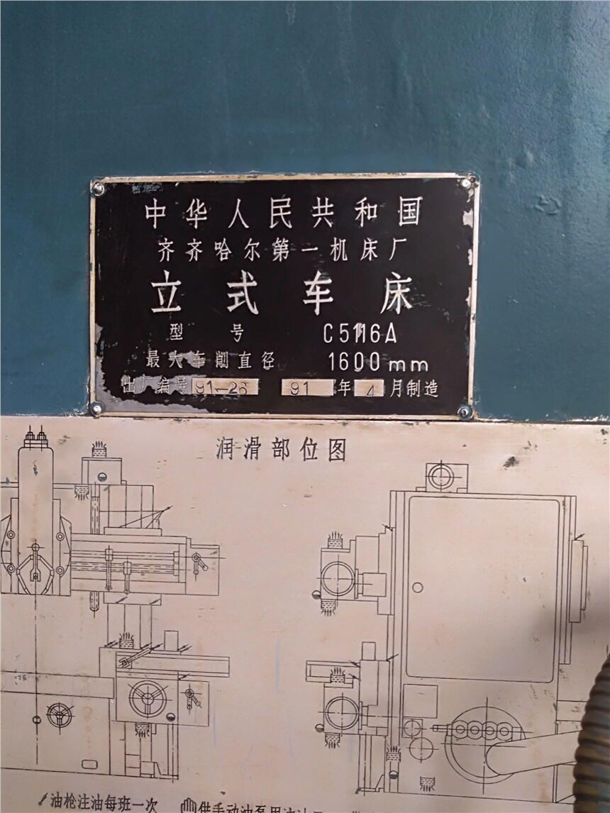 齐齐哈尔1.6米立车型号C5116A最大车削直径1600mm工作台1400mm加工高度800mm年代1991年