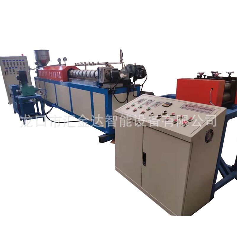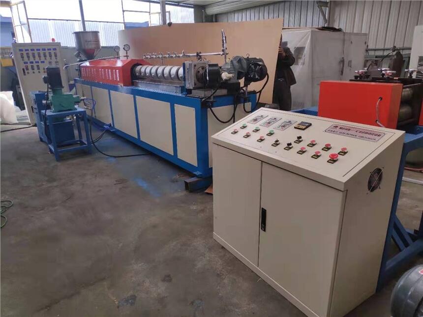 塑料发泡网挤出机组,将树脂等多种化工原料通过料斗加入料筒内,经过加热后将发泡气体注入料筒内,经料筒搅拌从模头挤出冷却成形,输入牵引机,经切刀自动切断制出不同规格的发泡网套,也可以通过更换机头、模具生产出不同规格的发泡网