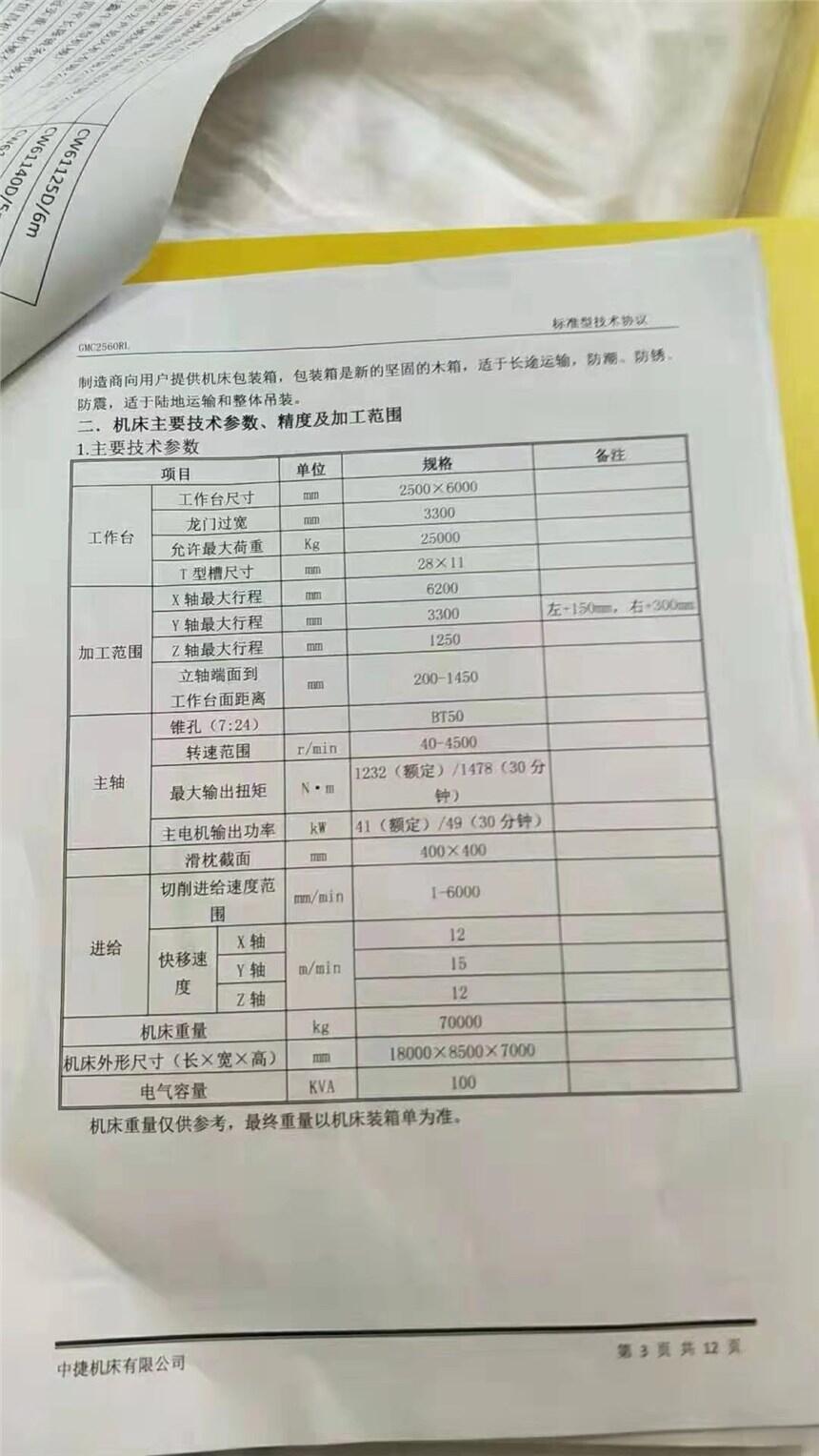 中捷龙门6米数控铣镗床型号GMC2560RL工作 台尺寸:2500*6000mm龙门过宽3300mmT槽尺寸:28*11三轴行程XYZ:6200*3300*1250mm承重:25吨锥度:BT50转速范围:40-4500r/min滑枕截面:400*400mm机床重量:70吨机床外形尺寸(长宽高):18000*8500*7000mm