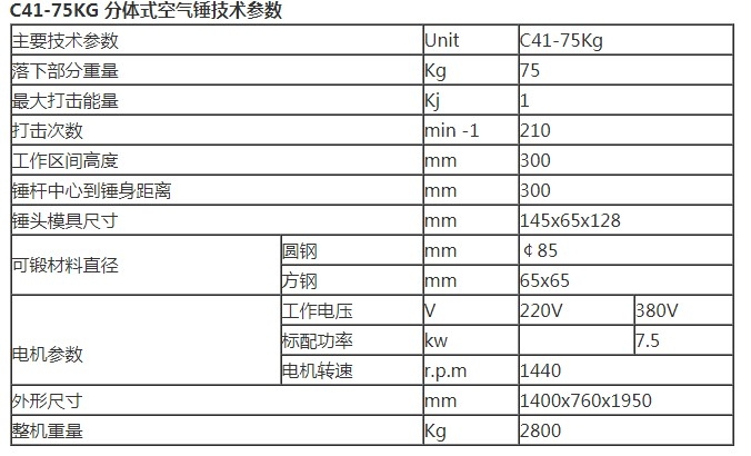 C41-75kg分体式空气锤是自由锻造设备的一种.有两个汽缸.压缩缸将空气压缩,通过分配阀送入工作汽缸,推动活塞连同锤头作上下运动起锤击作用。 该产品适用于各种自由锻造: 如:锻打、延伸、镦粗、冲孔、剪切、 锻焊、扭转、弯曲等。使用垫模即可进行各种开式模锻。广泛应用于小钢管、建筑、五金、电力器具、铁路等行业。