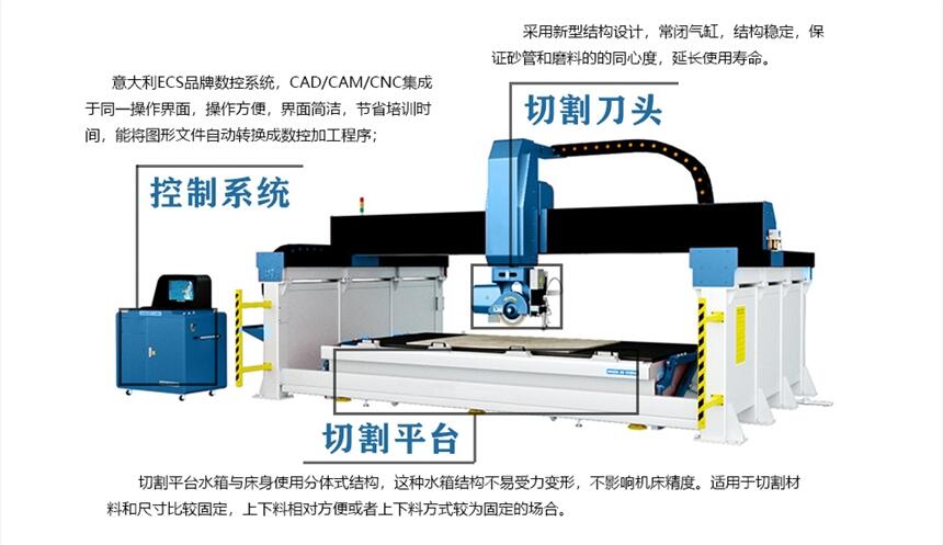 龙门式水刀切割机ECS控制系统基于Windows的专用水切割软件,具备图形参 数化输入功能,可实现标准图形直接作图,具 有图形模拟运行功能,图形输入自动编程功能 以及任何自动编程软件生成NC代码。