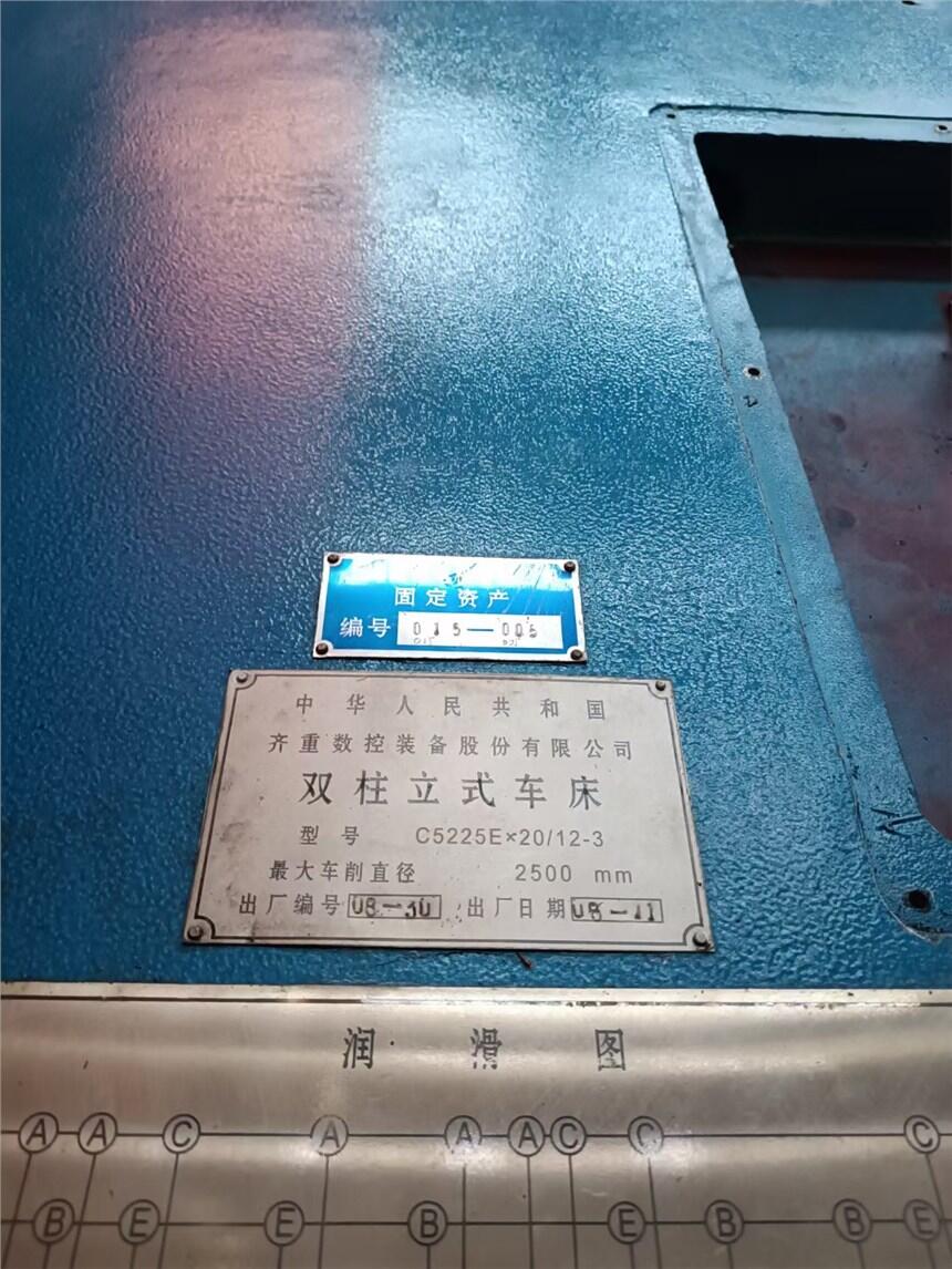齐重2.5米双柱立车型号C5225E×20/12工作台直径2250mm切削直径2500mm工件高度1600mm工件重量12吨刀杆截面尺寸:40*50mm右垂架切削力:3.5万N左垂架切削力:3万N总切削力6.3万N工作台扭矩63000N/min 工作台转速级数:16级工作台转速范围2-63R/min刀架进给级量级数:交流18级AC刀架进给量范围:.025-90mm右垂架行程水平1400mm垂直1250mm左右垂架角度30度正负刀架快速移动速度:1560mm/min横梁行程:1250mm/min衡量升降速度350MM/min主电机功率:交流55AC55工作台导轨形式:动压/静压导轨