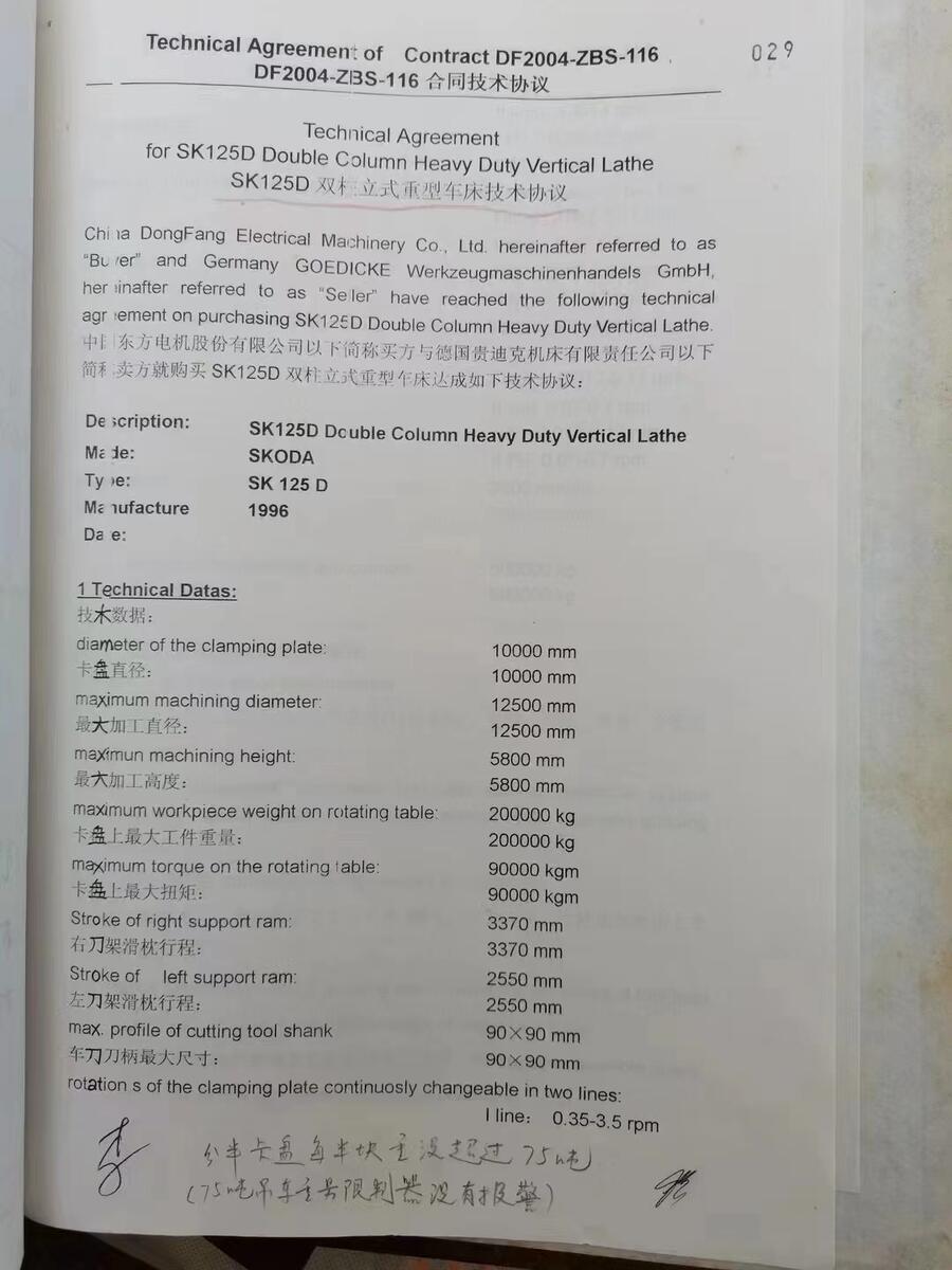 售:捷克斯柯达12.5米重型数控立车型号SK52125。加工直径可达到15米。加工高度可达到7米。卡盘10米。底坐7.6米。承重200吨。西门子系统。国内少有精大稀设备