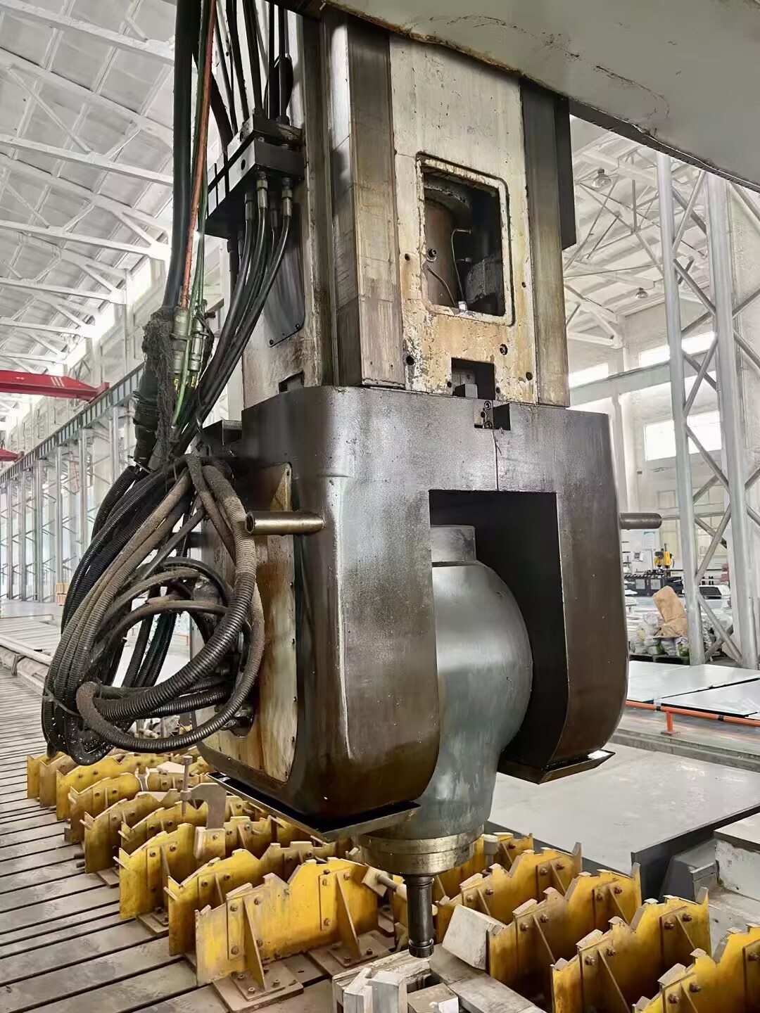 工作台尺寸:5000*26000mm梁立柱间距离:6300mm固定工作台承重25吨平方米,龙门框架移动:27米镗铣头水平移动7.3米镗铣头垂直移动:1.25米活动横梁垂直移动3.3米镗铣头主轴端面距离工作台端面距离4.5米机床整体重量约528吨,机床外形尺寸:40500*14200*9800mm