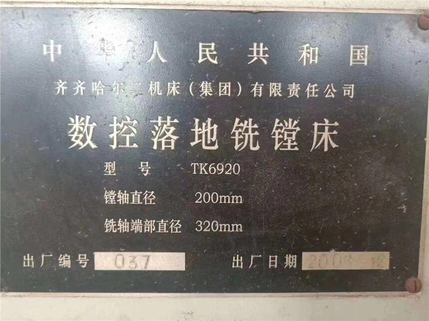 齐齐哈尔数控落地镗铣床TK6920/40x12加工高度4米,长度12米,铣杆直径200mm,镗轴端面320mm,W轴1.2米,Z轴1.2米,数控回转台2.5X3承重40吨,西门子840D系统,带3个铣头,平旋盘,安装少用,三轴全闭环,2006年产,安装少用在位