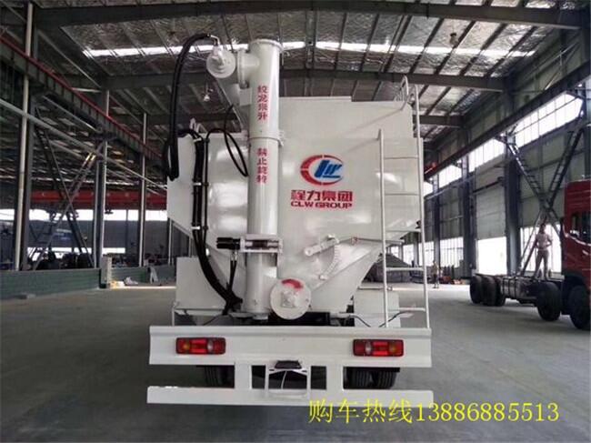 上装配置:罐体容积约30立方,罐体采用4mm优质碳钢板制作,罐分为肆个仓,可控制各分仓卸料顺序和速度,整车3条蛟龙(底部水平绞龙、尾部垂直绞龙、顶部卸料绞龙),由3个5.5kw 380v电机带动各绞龙工作,顶部绞龙液压控制举升,可左右180°,整车尺寸:10990×2490×3650mm,罐体尺寸:8000×2450×2250mm。