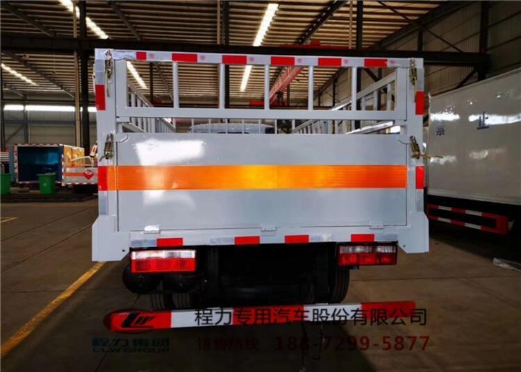 厢体配置:严格按照公告尺寸制作,外板采用1mm厚冷轧板有一次性成型的百叶窗,内饰为导电性能良好的铝板有透气孔,内衬为矩形管骨架牢靠稳定,内部填充为透气防潮阻燃的挤塑板,四种材料经现代工艺复合而成,厢体外部上下铝合金型材包边,底板和车厢前下部铺橡胶皮,后门双开,右侧中部单开门,内部有固定货物的卧环,车辆外部有静电带、灭火器、防火罩,车厢内安装烟雾报警器和门防盗报警器,严格按照危险品相关法规张贴。