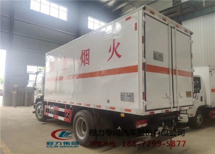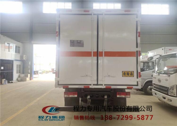 上装配置:严格按照公告尺寸制作,外板采用1mm厚冷轧板有一次性成型的百叶窗,内饰为导电性能良好的铝板有透气孔,内衬为矩形管骨架牢靠稳定,内部填充为透气防潮阻燃的挤塑板,四种材料经现代工艺复合而成,厢体外部上下铝合金型材包边,底板和车厢前下部铺橡胶皮,后门双开,右侧中部单开门,车辆外部有静电带、灭火器、防火罩,车厢内安装烟雾报警器和门防盗报警器,严格按照危险品相关法规张贴。