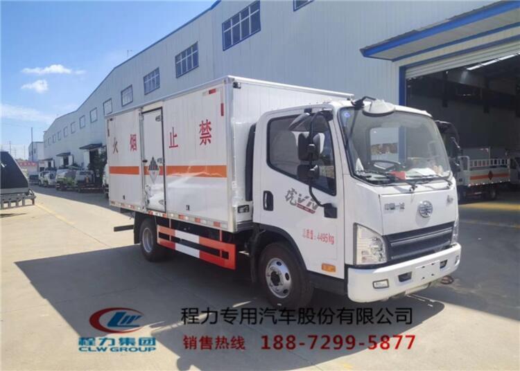 厢体配置:严格按照公告尺寸制作,外板采用1mm厚冷轧板有一次性成型的百叶窗,内饰为导电性能良好的铝板有透气孔,内衬为矩形管骨架牢靠稳定,内部填充为透气防潮阻燃的挤塑板,四种材料经现代工艺复合而成,厢体外部上下铝合金型材包边,底板和车厢前下部铺橡胶皮,后门双开,右侧中部单开门,车辆外部有静电带、灭火器、防火罩,车厢内安装烟雾报警器和门防盗报警器,严格按照危险品相关法规张贴。