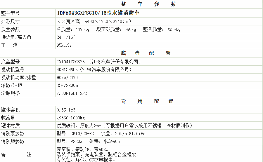江特牌江铃顺威蓝牌水罐消防车江特牌JDF5043GXFSG10/J6型水罐消防车,采用江铃JX1041TSCB26底盘改装而成。整车由消防员乘员室和车身两大部分组成,乘员室为原装双排,可乘坐2+3人,该车为内仓罐结构,车身前部为水罐+器材箱,后部为泵房。载液罐体为优质碳钢,与底盘采用弹性连接,载水1000kg,装备了湖北博利特种汽车装备股份有限公司生产CB10/20-BL型消防泵,额定流量20L/S,车顶安装湖北博利特种汽车装备股份有限公司生产的PS20型车用消防炮。该车辆结构紧凑,配置完备,机动性强,能够及时应对企业,社区或重点消防单位的火情,可以第一时间形成小型战斗力进行初期火灾的扑救和人员疏散撤离。可广泛应用于消防j援站,政府专职消防队,企业专职消防队等。