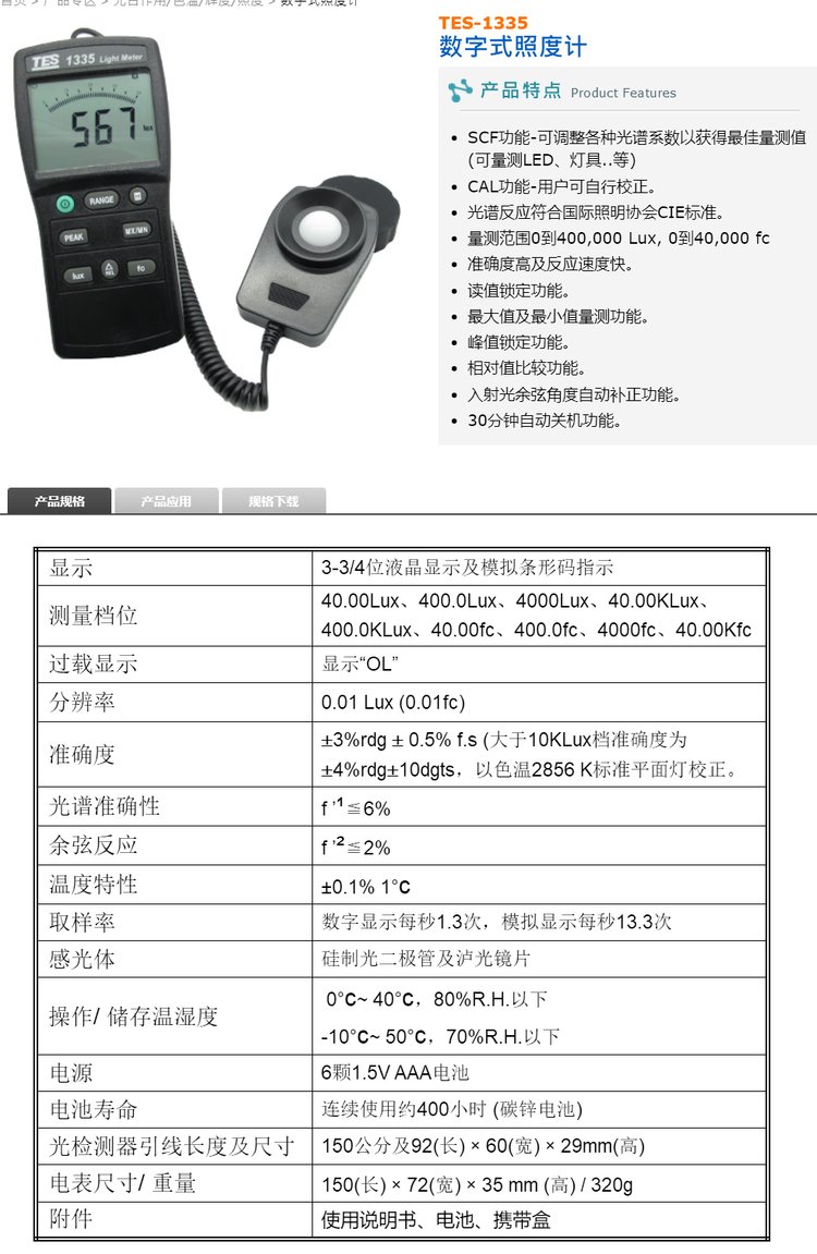 泰仕TES照度计照度仪TES-1335/1336A/1337B/1339/1339R照度表 品牌 | 台湾泰仕TES | ||