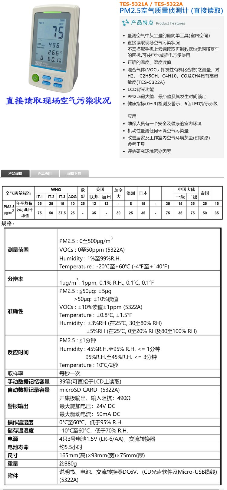 泰仕TES-5321/5322室内PM2.5测试计空气质量检测仪温湿度TVOC 品牌 | 泰仕TES | ||