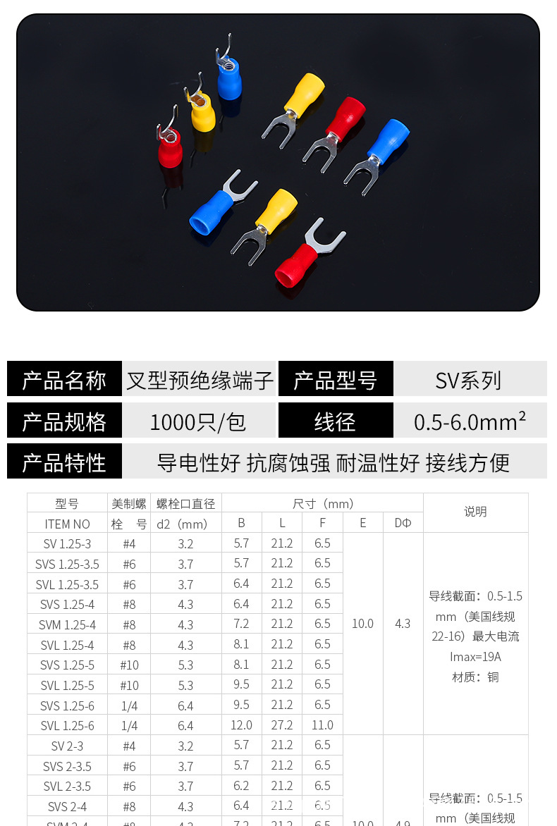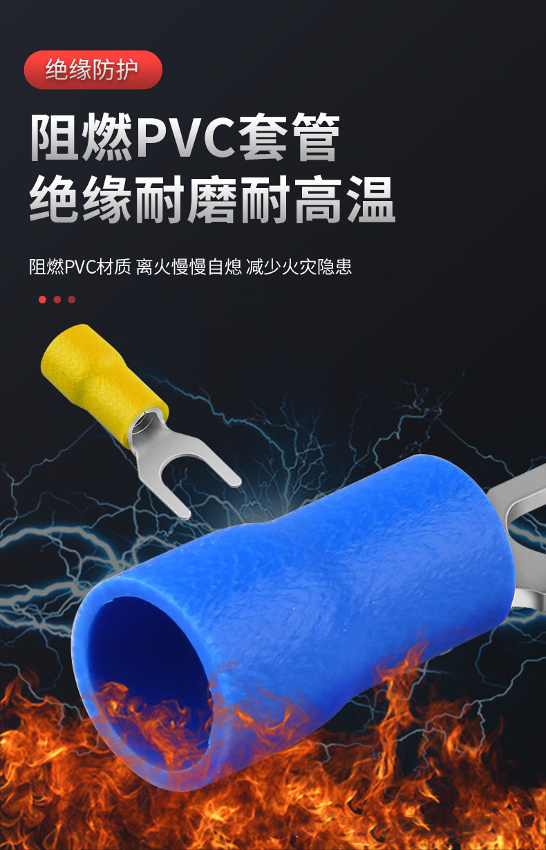 SV冷压接线端子黄铜U型叉形预绝缘线耳铜鼻子五色可选 1000只/包 型号 | SV1.25-4叉形绝缘端子 | ||