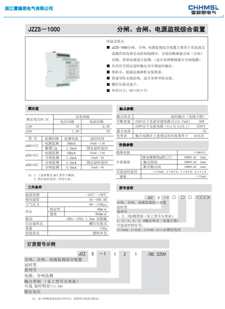 JZZS-1243/DC220V分闸 合闸 电源监视 综合装置使用说明书 品牌 | 霍穆思 | ||