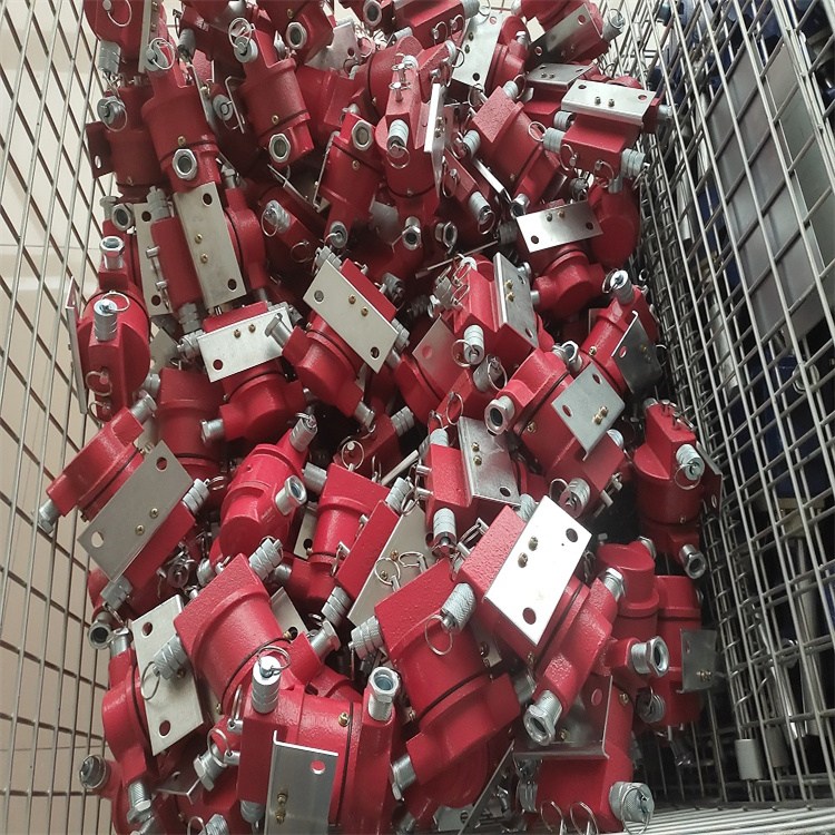 停闭锁开关适用于具有爆炸性混合气体的危险场所以及露天煤矿、选煤厂等工作场所,作为矿用带式输送机综合保护控制装置的紧急停车信号检测之用。闭锁开关可按8、4、2、1编码设定地址,当胶带输送机出现异常情况时,拉动急停闭锁开关拉绳,急停开关接通电源ARM芯片程序启动,急停闭锁开关带有故障显示,断电和位置信号通过CAN总线通讯输送到运输监控分站,分站显示出急停位置,并及时切断胶带输送机控制电源,实现急停保护,急停闭锁开关安装数量不限,并且均为并联连接。由于带有位置显示,给故障排除带来方便。 1.参数:自锁;按下复位把手,急停开关内的接点断开;外形尺寸:165mm×90mm×160mm;接点容量:30V/10A;接点接触电阻≤0.1Ω,振动、冲击后≤0.2Ω;动作力:60N±10N ;复位力:60N±10N;动作性能:急停开关任一边的驱动拉环上向外施加作用力时,急停开关内的接点状态接通并 2.急停闭锁开关工作原理:急停开关任一边的急停拉环上向外施加60N±10N的作用力并产生位移时,急停开关内的行程开关动作,接点状态翻转,并自锁;在相应的复位拉环上向外施加60N±10N的作用力时,急停开关内的行程开关再次动作,接点状态复原。 3.急停闭锁开关安装:将急停开关安装在皮带机两侧的支架上,用拉绳依次把急停开关的急停拉环分别相连,打开急停开关接线盒,用电缆将J(急停信号)、O(电源地)接至带式输送机综合保护控制装置主机内对应的接线端子上。