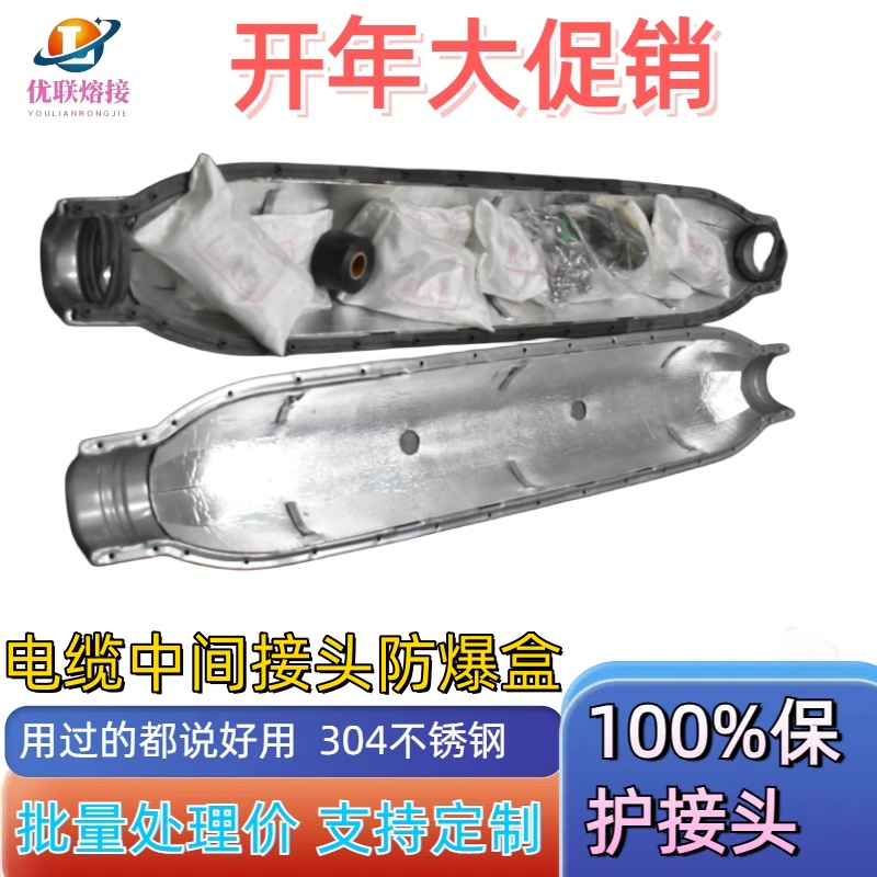 本产品主材采用高强度的304不锈钢材料,内表面贴合柔性防火棉(铝箔包覆)。中间接头主体采用自粘性防火抗电弧胶带进行包覆,防爆盒两端内部与电缆间隙处塞上膨胀阻燃型柔性防火泥,其次防爆盒内放入膨胀型防爆阻火包,再加上外部高强度阻燃防爆盒的保护,整体结构采用三层防火防爆的方式,从而达到整体防火防爆的作用, 产品通过了国家防爆电气产品质量监督检验中心防爆合格证验证和检测,满足标准GB 3836.1-2010《爆炸性环境第1部分:设备通用要求》、GB 3836.3-2010 《爆炸性环境 第3部分:由增安型“e”保护的设备》要求。本产品主要应用于电力电缆中间接头在发生故障时,将爆炸所产生的高压气流、火焰及碎片限制在防爆盒内,也防止故障引起的火灾蔓延和爆炸冲击对其他电力设施造成大范围的危害。防火防爆盒安装在中间接头外部,正常运转时能保护中间接头免受外力破坏,具有一定的机械保护作用,同时阻止因接头周边电力设施燃烧蔓延而损坏中间接头。当中间接头因意外故障失火、爆炸时能起到防火、防爆的作用,也能对电缆沟内其它电缆或周边设备有一定的防护隔离作用;中间接头防火防爆盒为两半抱合,现场施工安装方便。防爆盒两边法兰结合处有密封胶条,两端再缠上防水带,有一定的防水性能。
