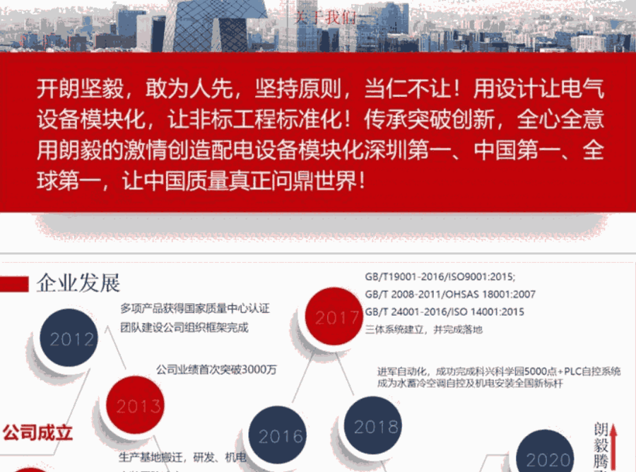 深圳市朗毅机电工程有限公司成立于贰零零玖年肆月贰日,是一家专业从事低压配电工程设计和施工;10KV以下高低压变配电工程;电力抢修;高低压成套设备的设计、生产;配电柜和配电箱设计、生产和安装于一体的综合性企业。 我们秉承“设计弘扬品牌,品质固我根本,服务创造明天”的经营理念,公司推行了全员质量管理,建立了首检、互检、终检、出厂试验等完善的质量管理体系,可视化进料、可视化生产、可视化检验、可视化测试和可视化安装,让我们的过程客户可以完全掌控。同时也建立了一整套的服务规范和完善的售前、售中、售后服务体系。凭着“朗心独见,士为弘毅,为了让中国质量接轨国际甘愿做一个永不放弃的探路者”的企业精神,以及终身能效比的先进设计理念、全程公开化的品质管理模式、完善的全程服务和专业的销售队伍,以深圳为中心辐射全国的战略格局,已成功在省内珠三角地区,省外的湖南、湖北、江西、江苏、广西、重庆等全国大部分省市销售。