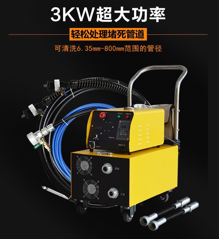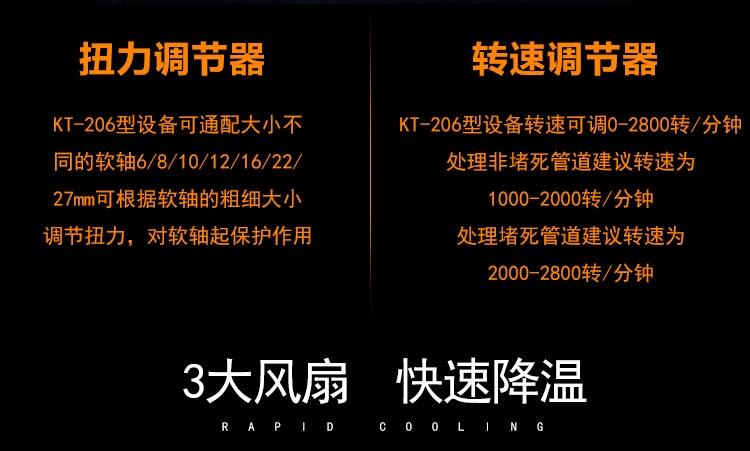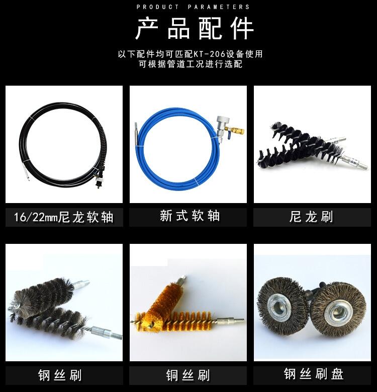 KT-206是一款针对解决大型换热器管道内部污垢堵塞的一款管道疏通设备,可疏通空气预热器/煤气初冷器/凝汽器/油冷却器/热交换器/蒸发器等化工管道,适用于化工厂/发电厂/水泥厂/火力发电厂等需要用到大型锅炉换热管道的设备,常见用于生物质锅炉管道/气动锅炉管道/高压锅炉管道/链条炉管道等内部结垢比较严重的管道.疏通效果堪比超高压清洗机,但改设备体型较小方便携带,性价比也很高,最重要的是使用工人的安全性也可以得到保障.