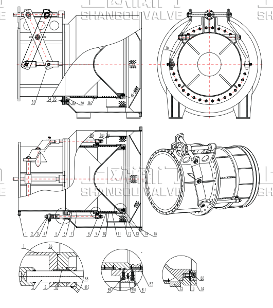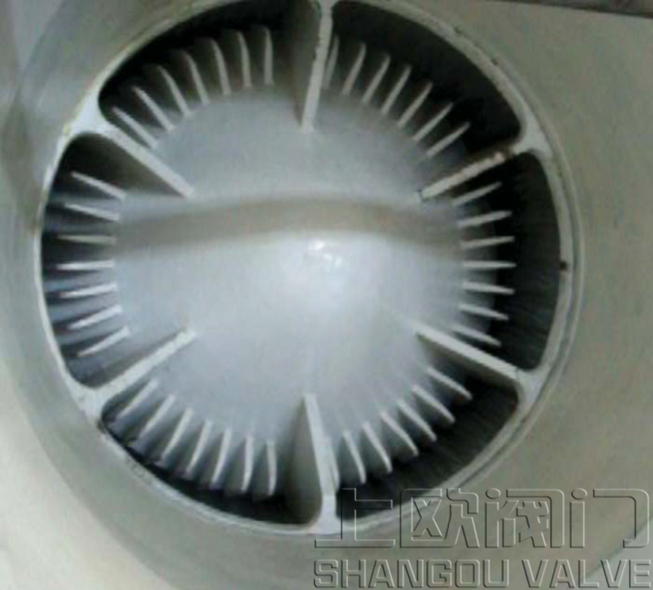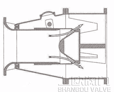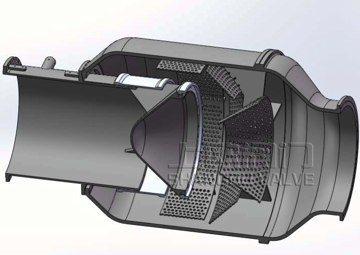固定锥形阀由执行机构,机械驱动,带60号哈氏合金垫条的焊接钢体,60号哈氏合金阀座。喷管与固定锥通过呈放射状的叶片支撑与连接。喷管与椎体之间保留一段无管壁开放段,套筒闸安装在喷管外部,通过套筒闸的轴向移动改变无管壁开放段的长度,起到调整阀门开度的作用。阀门出口处可根据实际工况设置导流罩,导流罩可约束阀门出口水流的流态,可以进一步避免气蚀的破坏和喷射范围过大的损害。管中型锥形阀一般应加导流罩,使阀门后端管道免受气蚀破坏。排放型安装在管道的末端,起泄压、保压和水位控制等作用。