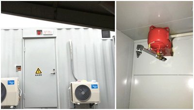 储能集装箱消防系统由气体灭火剂瓶组、管路、喷嘴、信号反馈部件、火灾探测器和控制器、紧急启动/停止按钮、声光气指示灯等组成,从而实现对防护区自动探测、报警、灭火保护功能。当感测到烟雾、温度的变化时,声光报警器会立马响 灭在火灾前期,储能集装箱的安全性。