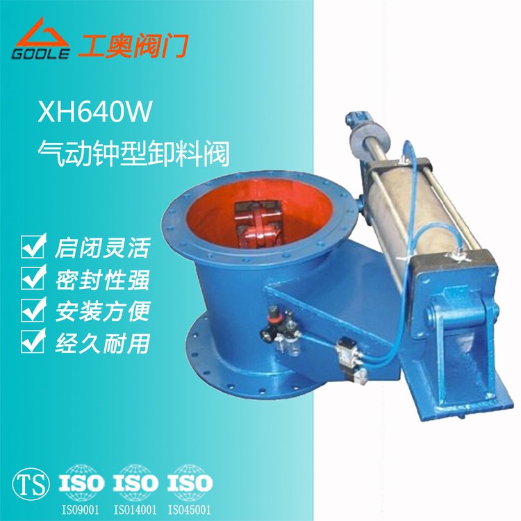 XH640W气动钟型卸灰阀,又称钟式卸灰阀,由阀体、锥形阀塞(锥形钟)、连杆、重锤等零件组成。用连杆拉动锥形阀塞上下运动完成启闭动作。XH640X型密封部位为橡胶软密封,本阀应用于冶炼高炉喷煤系统煤粉输送控制, XH640W型密封部位为阀体本体材料密封,本阀应用于除尘系统尘灰输送控制。以上两种型号钟型卸灰阀也适用于其他工业炉窑类似的系统中使用。