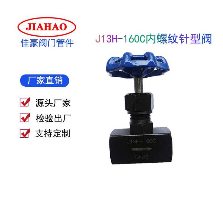 佳豪J13H-64C J13H-160C碳钢内螺纹针型阀 内丝仪表截止阀,内螺纹针型阀一般螺纹为英制G螺纹,也可以是公制M螺纹 ,也可以是美制NPT螺纹 ,具有耐压高, 的特点。主要型号有J13H-16C J13H-25C J13H-32C J13H-40C J13H-64C J13H-160C等?规格主要有DN6 DN10 DN15? DN20 DN25,对应螺纹尺寸G1/4? G3/8 G1/2 G3/4 G1",20#碳钢材质具有良好的钢性和韧性,耐压高,