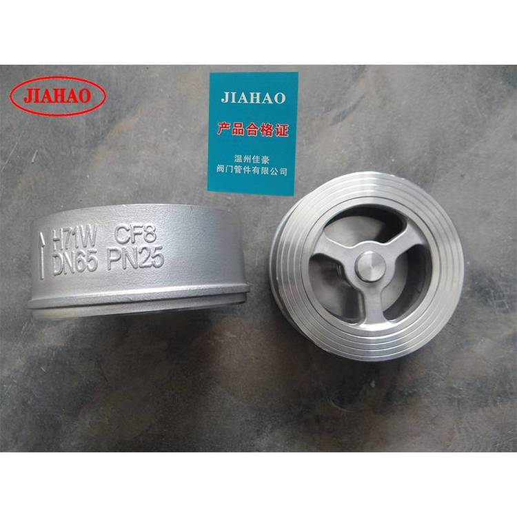 佳豪H72W-16P H72W-25P H72W-32P H72W-40P 不锈钢对夹式单向止回阀,法兰对夹式连接方式 耐压高 ,外表光亮,重量重, , 主要规格有DN15 DN20 DN25 DN32 DN40 DN50 DN65 DN80 DN100 DN125 DN150 DN200等,对夹式止回阀,结构简单,弹簧单板式,在流体的正向压力下打开,反向压力就关闭,达到防止介质倒流的作用。