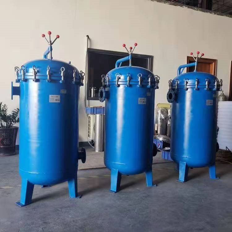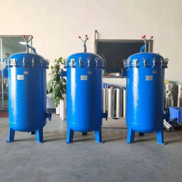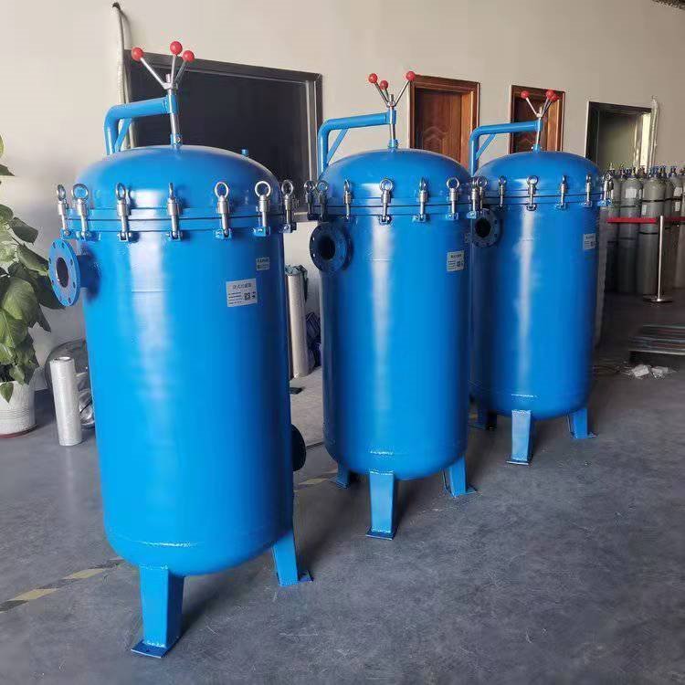 多袋式过滤器采用侧进底出方式(也可采用底进底出方式),通过管道中的压力将过滤液体介质压入或抽入过滤器桶体,要过滤的液体介质经由电抛光冲孔支撑滤蓝承托的过滤袋的过滤,产生理想的固液分离达到液体介质被过滤的效果。