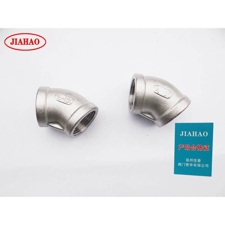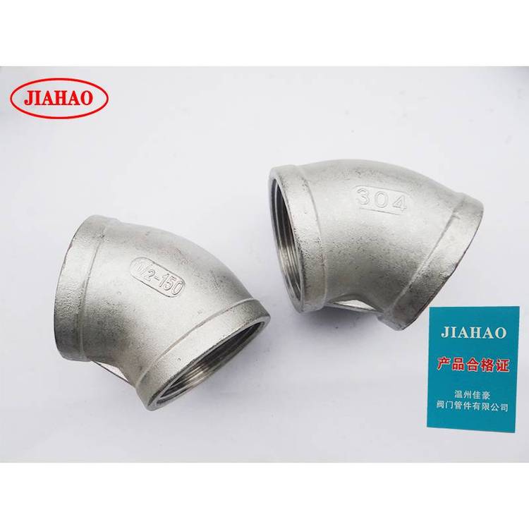 佳豪GB/T26120 304SS不锈钢内螺纹内丝45°度弯头,内螺纹一般是英制螺纹,英制螺纹一般用几分几寸螺纹表示,如2分牙是1/4,对应的公称通径是DN6,4分牙对应是的1/2,对应的公称通径是DN15等,铸造毛坯 一般在低压管道应用,流量大,数控加工螺纹光滑,外表美观,在民用水暖工程,机电工程 气源工程 化工工程等各种工程管道中应用。