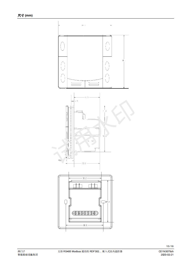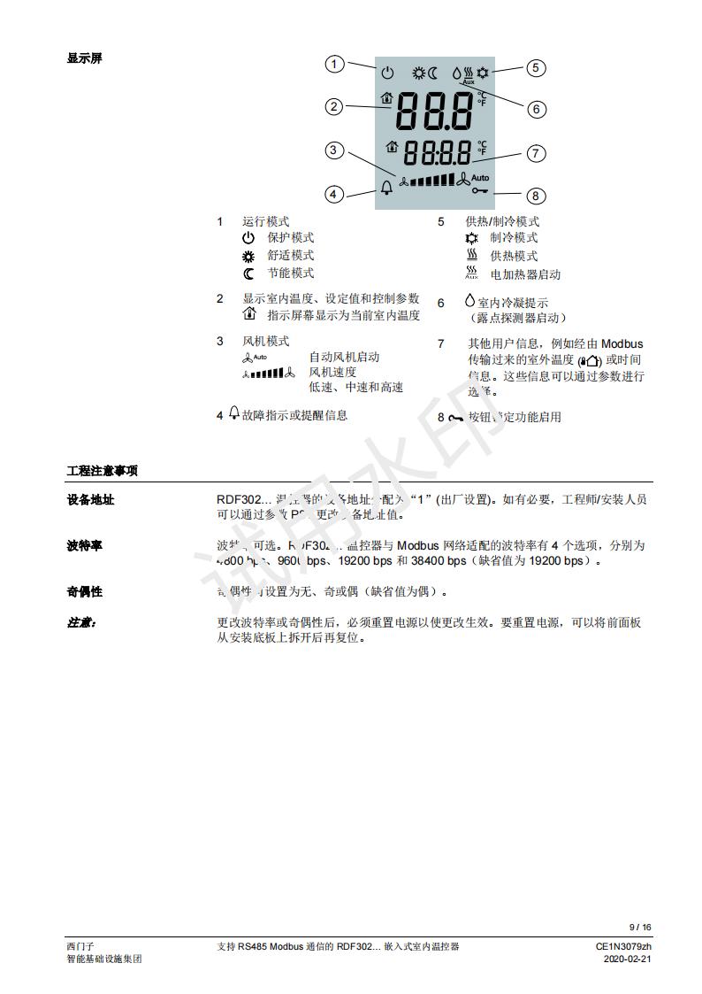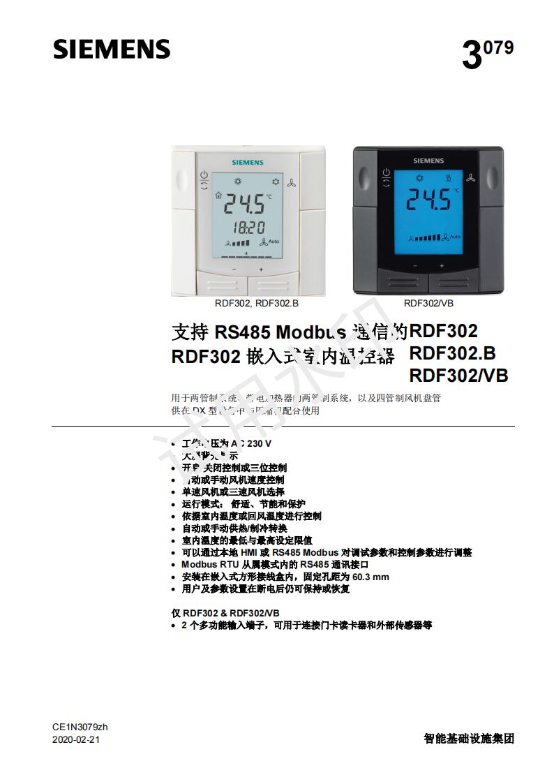 西门子嵌入式室内温控器 RDF302 RDF302.B RDF302/VB支持 RS485 Modbus 安装方式 | 嵌入式 | ||