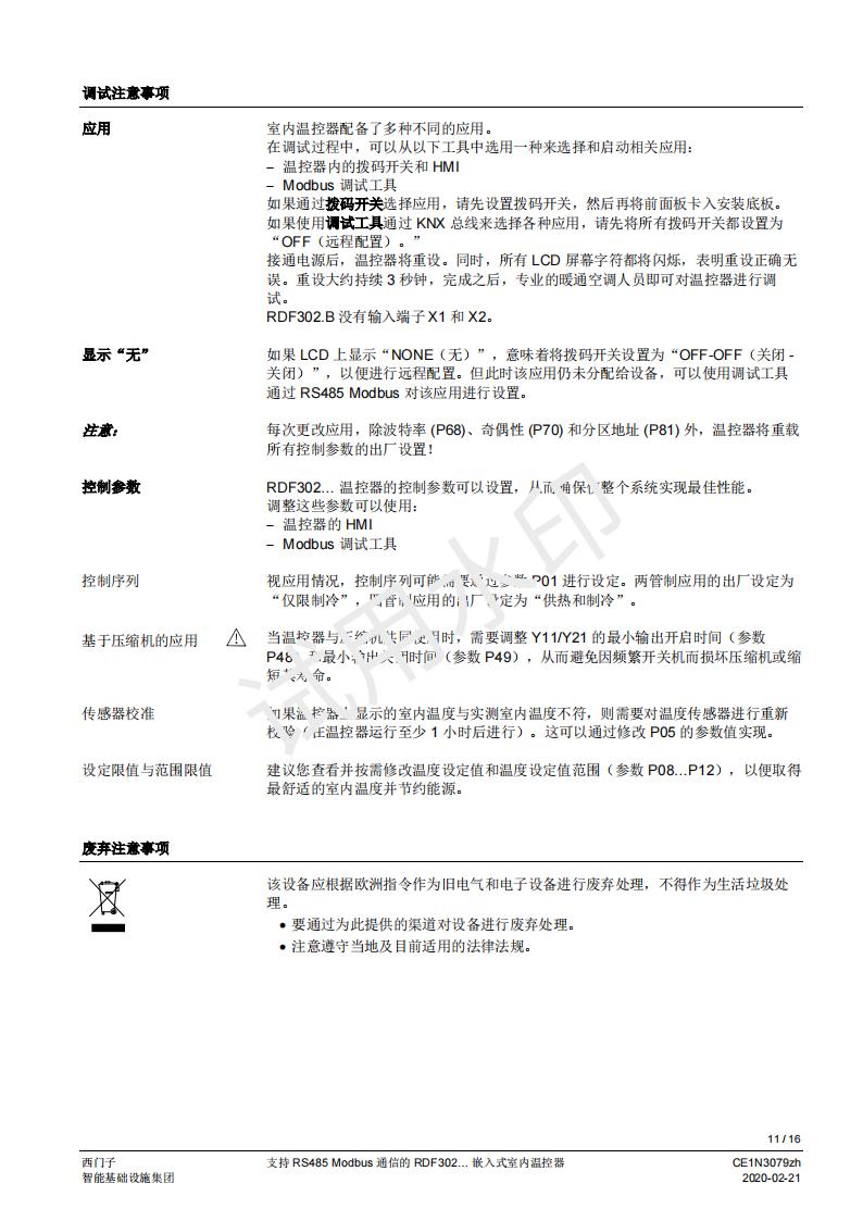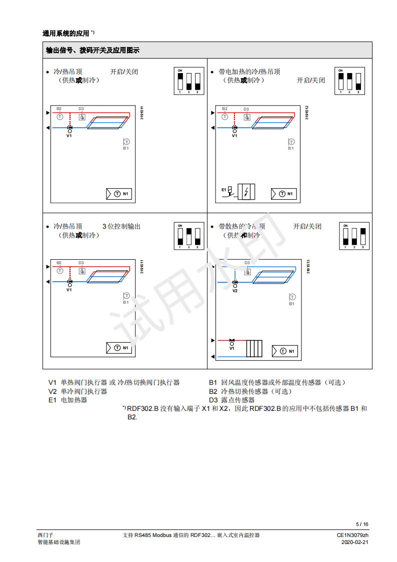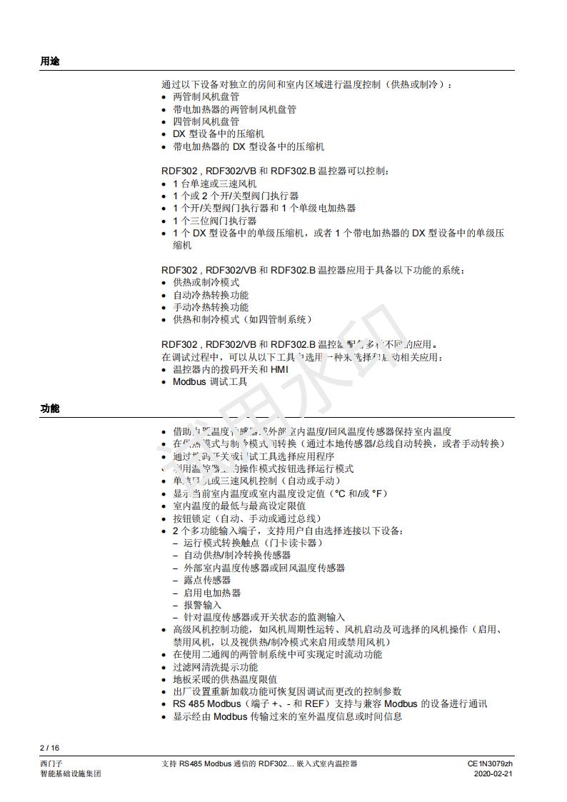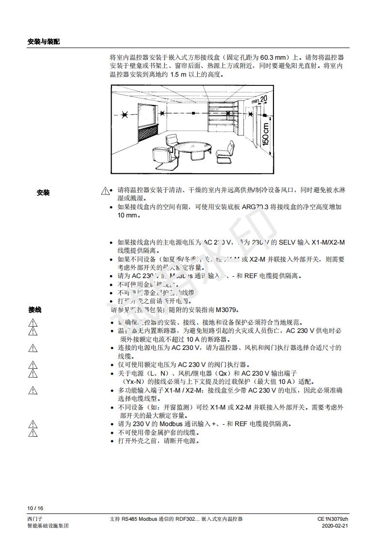 西门子嵌入式室内温控器 RDF302 RDF302.B RDF302/VB支持 RS485 Modbus 安装方式 | 嵌入式 | ||