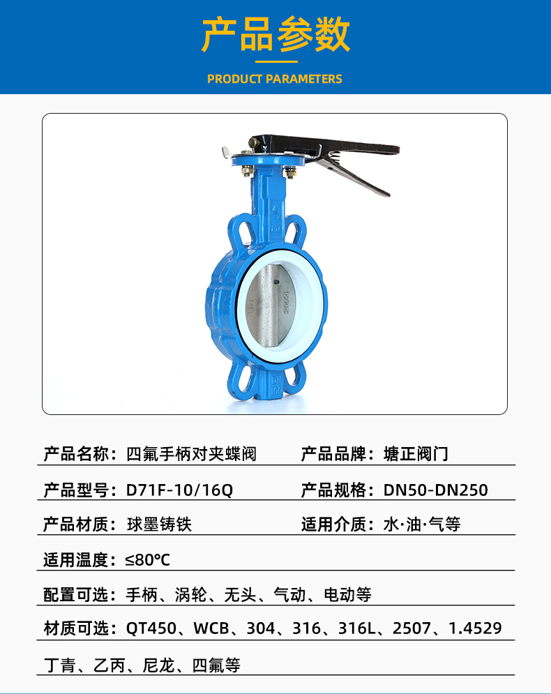四氟手柄对夹式蝶阀 D71F-10/16Q 软密封碟阀 工业双向手动阀门 产品 | 四氟手柄对夹式蝶阀 | ||