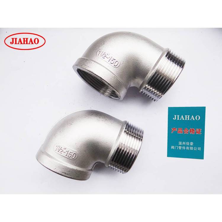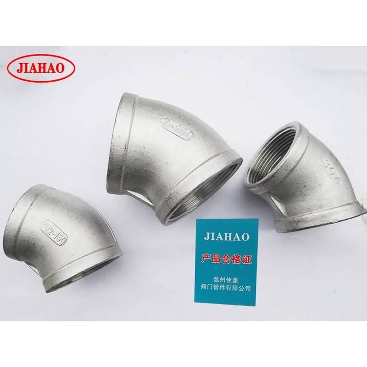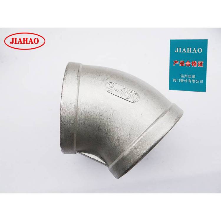 佳豪GB/T26120 304SS不锈钢内螺纹内丝45°度弯头,内螺纹一般是英制螺纹,英制螺纹一般用几分几寸螺纹表示,如2分牙是1/4,对应的公称通径是DN6,4分牙对应是的1/2,对应的公称通径是DN15等,铸造毛坯 一般在低压管道应用,流量大,数控加工螺纹光滑,外表美观,在民用水暖工程,机电工程 气源工程 化工工程等各种工程管道中应用。