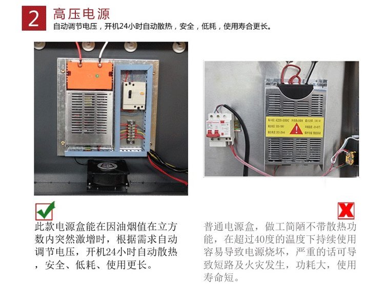 HJ系列油烟净化器为二级式静电吸附型,用来去除细微粒径的碳氢化合物和其它空气中的杂粒。它的二级式是指电离段与收集段,每个电离段由一系列钨钢线组成,安装在一系列接地板中间,并通给直流电。大气中的微粒在通过电离器的强力静电场时,被电离并带有正或负电荷。