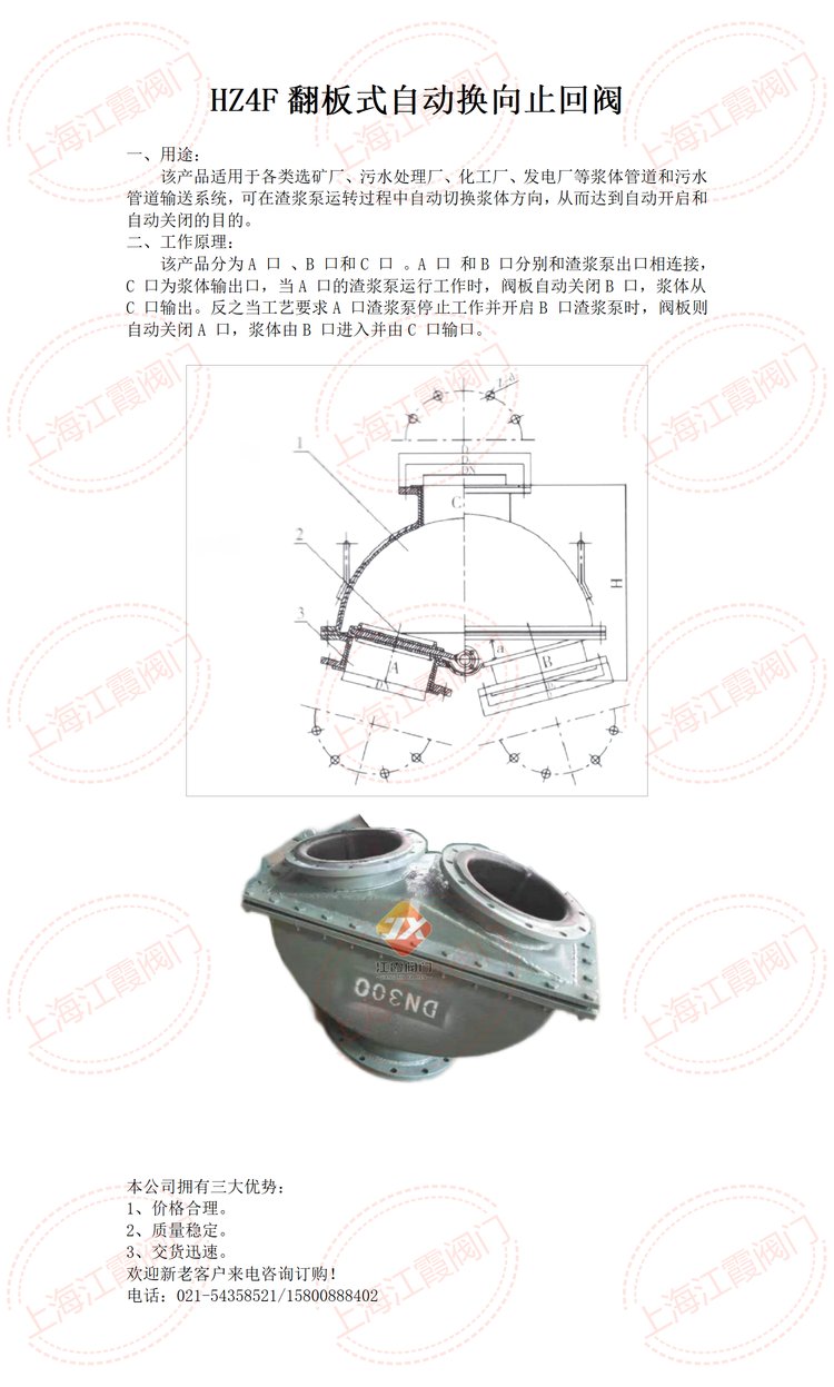 由上海江霞阀门供应HZ4F-10C翻板式自动换向止回阀,HZ4F-150C翻板式自动换向止回阀、翻板式自动换向止回阀HZ4F-200C、HZ4F-250C止回阀、HZ4F翻板式自动换向止回阀、HZ4F-1.0C翻板式自动换向止回阀、矿浆自动换向止回阀、HZ4F-1.0C止回阀、自动换向止回阀HZ4F-300C、HZ4F-350C、HZ4F-125C翻板式自动换向止回阀、HZ4F-400C、HZ4F-450C、翻板式自动换向止回阀,自动换向三通止回阀,翻板式三通自动换向止回阀、翻板式三通止回阀