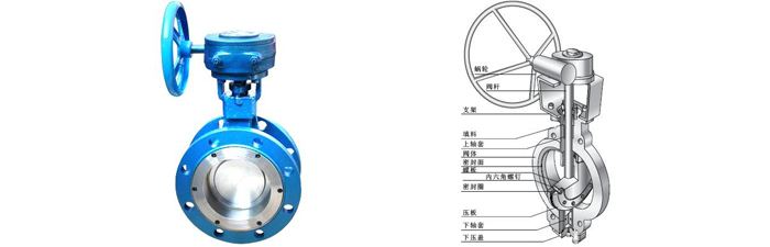 蝶板的回转中心(即阀杆的中心)位于阀体的中心线和蝶板的密封面截面上。阀座采用合成橡胶。关闭时蝶板的外圆密封面挤压合成橡胶阀座,使阀座产生弹性变形,从而形成弹性力作为密封比压保证蝶阀的密封。法兰蝶阀密封结构采用聚四氟乙烯、合成橡胶构成复合阀座、其特点在于阀门的弹性仍由合成橡胶提供并利用聚四氟乙烯的摩擦系数低、不易磨损、不易老化等特性,从而使蝶阀的寿命得以提高。
